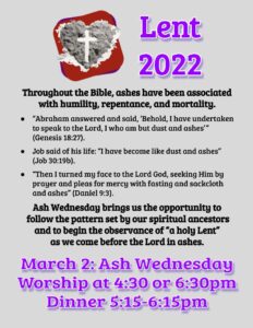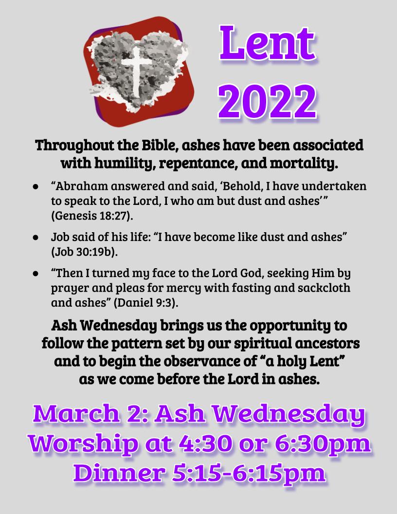 Ash Wednesday Worship 4:30 or 6:30pm Calendar Add to Calendar Add to Timely Calendar Add to Google Add to Outlook Add to Apple Calendar Add to other calendar Export to XML When: March 2, 2022 @ 4:30 pm – 7:30 pm 2022-03-02T16:30:00-06:00 2022-03-02T19:30:00-06:00 Dinner Host: Youth