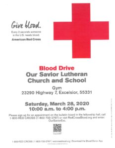 Sign up to give blood at redcrossblood.org. Enter OurSaviorExc in the find a blood drive box on the top right.