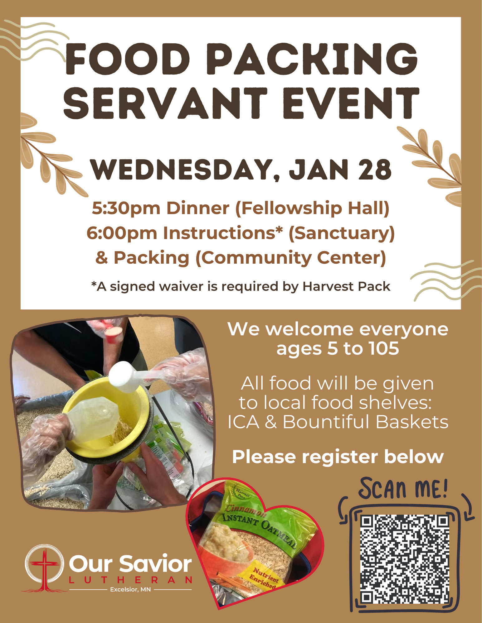 6:00 Instructions (Sanctuary) and Packing (Community Center)