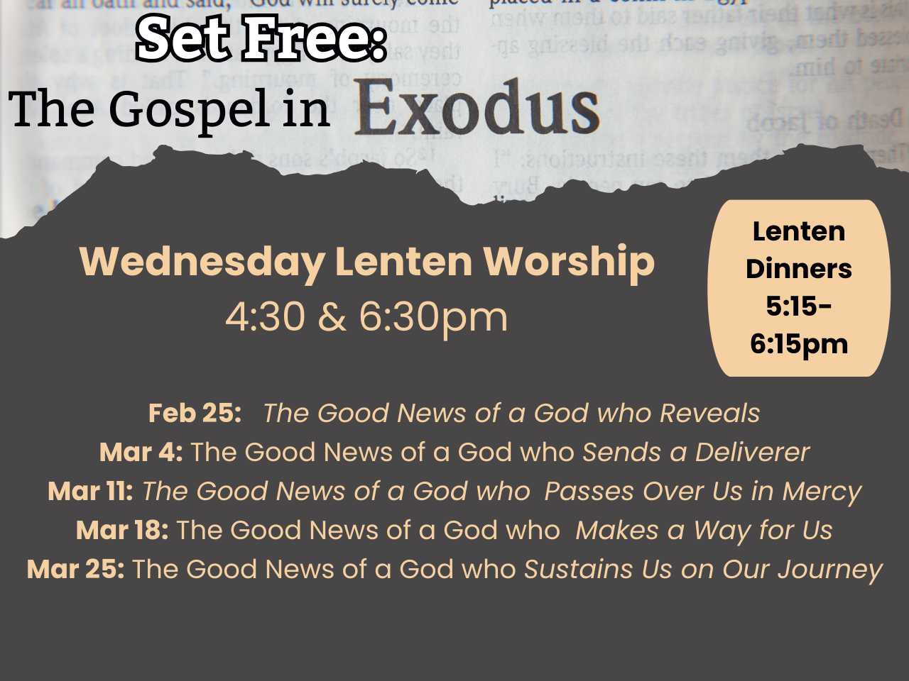 Lenten Wednesday Worship Calendar Add to Calendar Add to Timely Calendar Add to Google Add to Outlook Add to Apple Calendar Add to other calendar Export to XML When: March 18, 2026 @ 6:30 pm – 7:30 pm Repeats 2026-03-18T18:30:00-05:00 2026-03-18T19:30:00-05:00