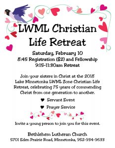 LWML Christian Life Retreat Calendar Add to Calendar Add to Timely Calendar Add to Google Add to Outlook Add to Apple Calendar Add to other calendar Export to XML When: February 10, 2018 @ 8:45 am – 11:30 am 2018-02-10T08:45:00-06:00 2018-02-10T11:30:00-06:00 Where: Bethlehem Lutheran Church 5701 Eden Prairie Rd Minnetonka, MN 55345 USA Cost: $2