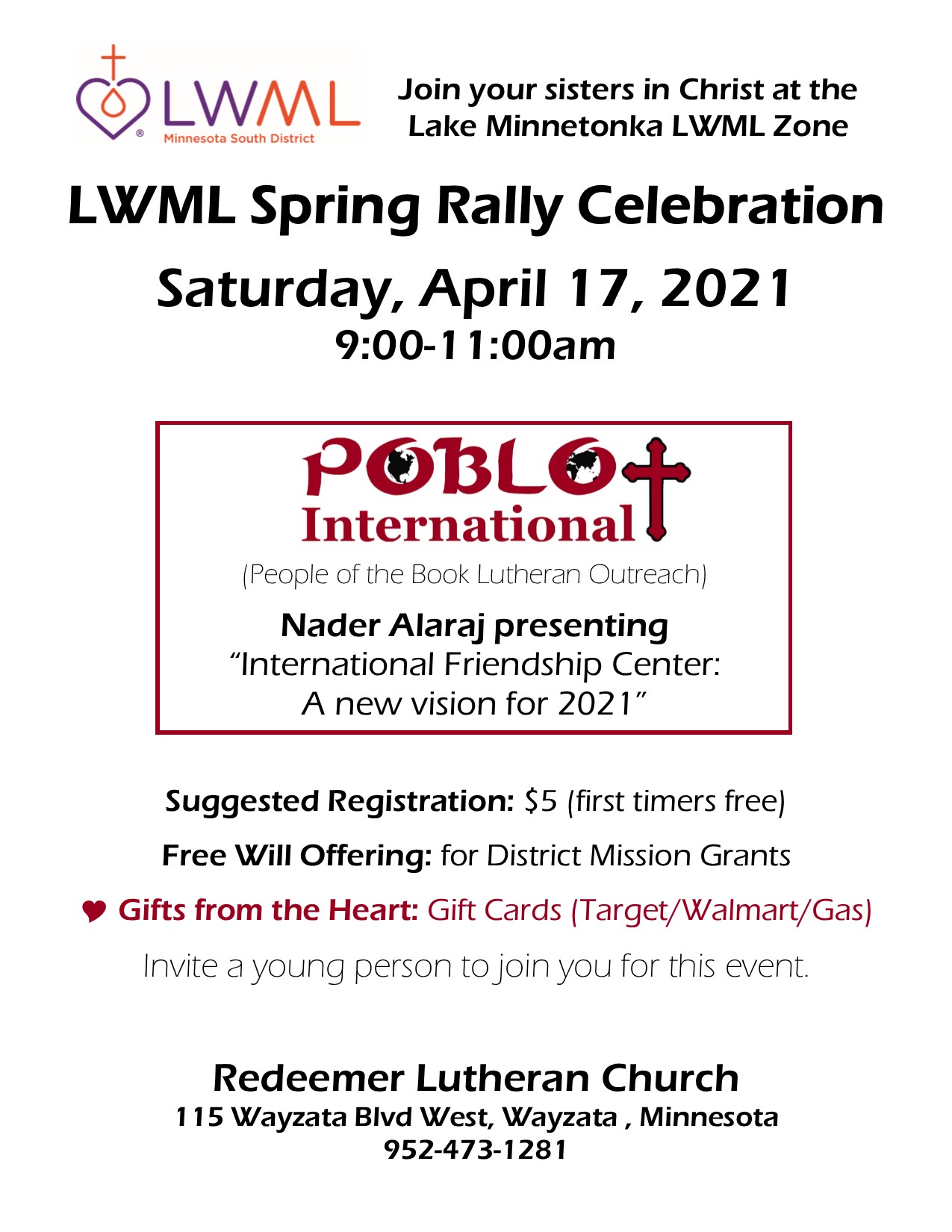 LWML Spring Zone Rally Calendar Add to Calendar Add to Timely Calendar Add to Google Add to Outlook Add to Apple Calendar Add to other calendar Export to XML When: April 10, 2021 @ 9:00 am – 11:00 am 2021-04-10T09:00:00-05:00 2021-04-10T11:00:00-05:00 Where: Redeemer Lutheran Church 115 Wayzata Ave West Wayzata MN