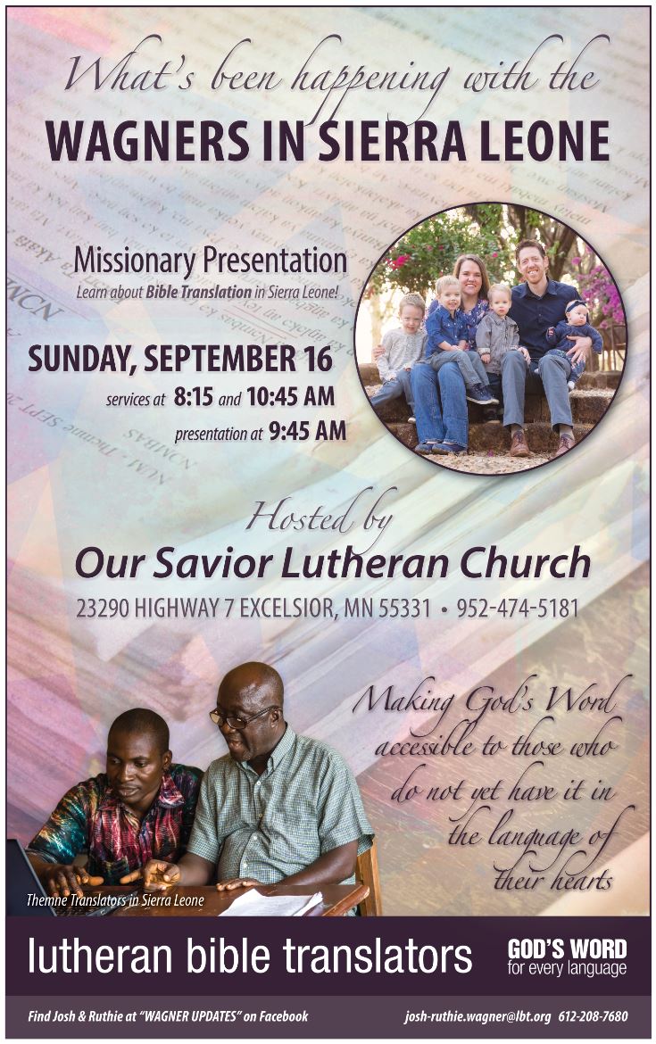Come and Listen to Josh & Ruthie Wagner, Missionaries in Sierra Leone, Africa. They will be doing the children’s message and will also alead our Bible Study from 9:45-10:30am.