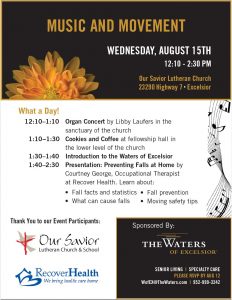 Music & Movement Calendar Add to Calendar Add to Timely Calendar Add to Google Add to Outlook Add to Apple Calendar Add to other calendar Export to XML When: August 15, 2018 @ 12:10 pm – 2:30 pm 2018-08-15T12:10:00-05:00 2018-08-15T14:30:00-05:00 Where: Our Savior Fellowship Hall, Door #3 23290 MN-7 Excelsior, MN 55331 USA Cost: Free