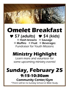 Omelet Breakfast (No SS or Bible Study) Calendar Add to Calendar Add to Timely Calendar Add to Google Add to Outlook Add to Apple Calendar Add to other calendar Export to XML When: February 25, 2018 @ 9:15 am – 10:30 am 2018-02-25T09:15:00-06:00 2018-02-25T10:30:00-06:00 Where: Community Center/Gym Cost: $7 adults, $4 kids