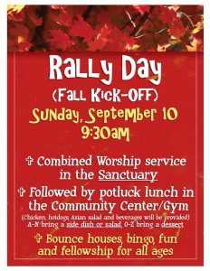 Rally Day (Fall Kick-Off) Calendar Add to Calendar Add to Timely Calendar Add to Google Add to Outlook Add to Apple Calendar Add to other calendar Export to XML When: September 10, 2017 @ 9:30 am – 12:00 pm 2017-09-10T09:30:00-05:00 2017-09-10T12:00:00-05:00 Where: 23290 MN-7 Excelsior, MN 55331 USA