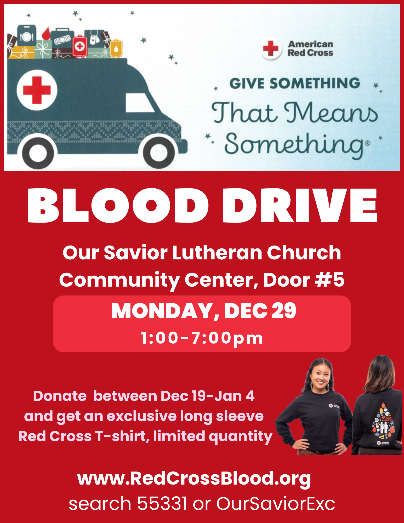 Donate between Dec 19-Jan 4 and get an exclusive long sleeve Red Cross T-shirt, limited quantity.