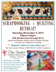 Scrapbooking & Quilting Retreat Calendar Tickets Add to Calendar Add to Timely Calendar Add to Google Add to Outlook Add to Apple Calendar Add to other calendar Export to XML When: November 9, 2019 @ 9:00 am – 9:00 pm 2019-11-09T09:00:00-06:00 2019-11-09T21:00:00-06:00 Where: Our Savior Lutheran Church, Door #5 23290 Highway 7 Excelsior MN Cost: 50.00 Register today!