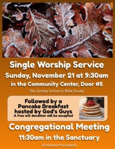 10:30am Pancake Breakfast by God’s Guys (Free will offering will be taken)