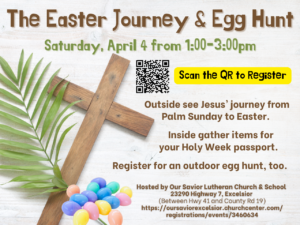 The Easter Journey & Egg Hunt Calendar Add to Calendar Add to Timely Calendar Add to Google Add to Outlook Add to Apple Calendar Add to other calendar Export to XML When: April 4, 2026 @ 1:00 pm – 3:00 pm 2026-04-04T13:00:00-05:00 2026-04-04T15:00:00-05:00 Register here!