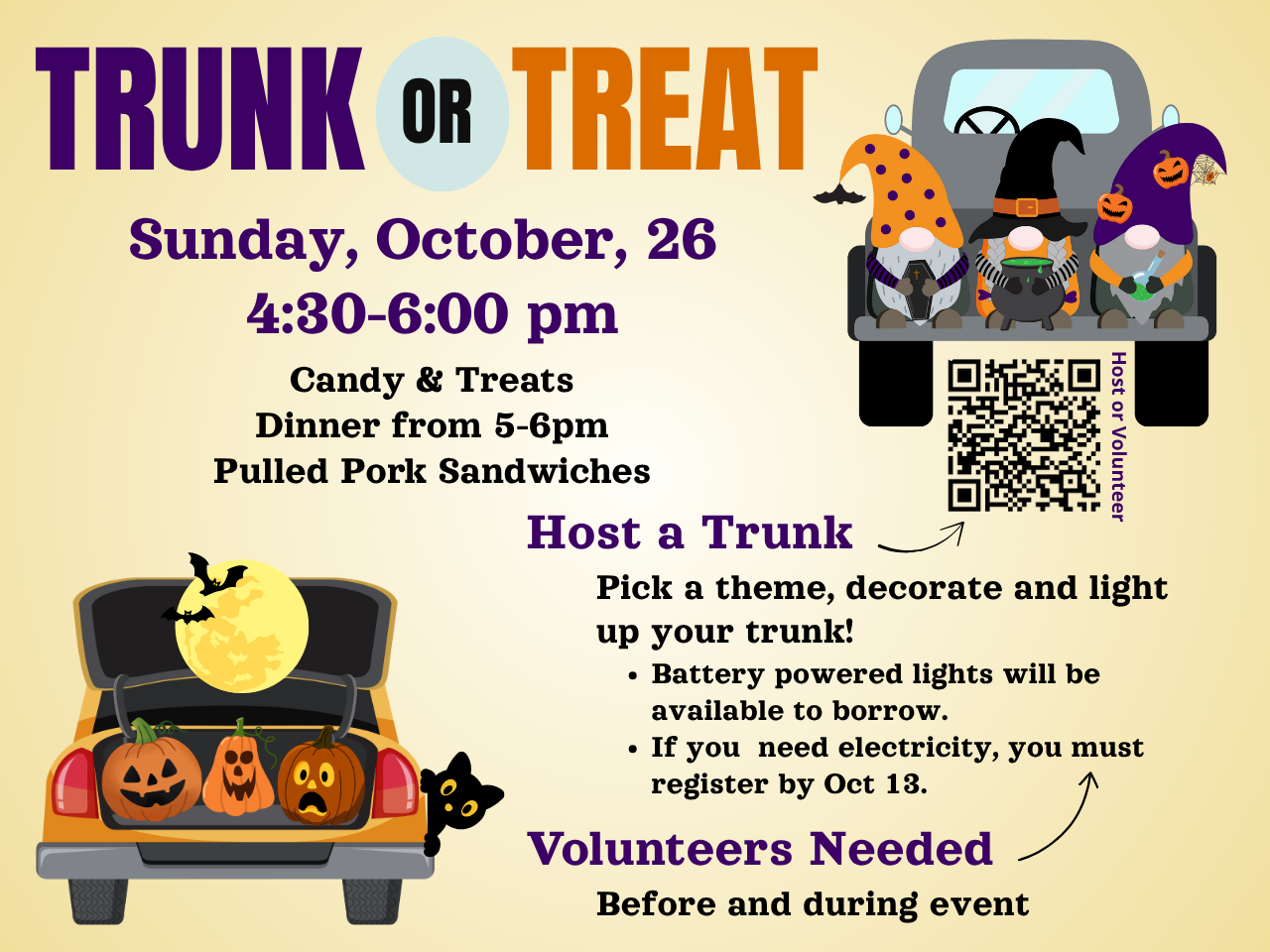 Trunk or Treat, Sunday, October 26 from 4:30-6:00pm
